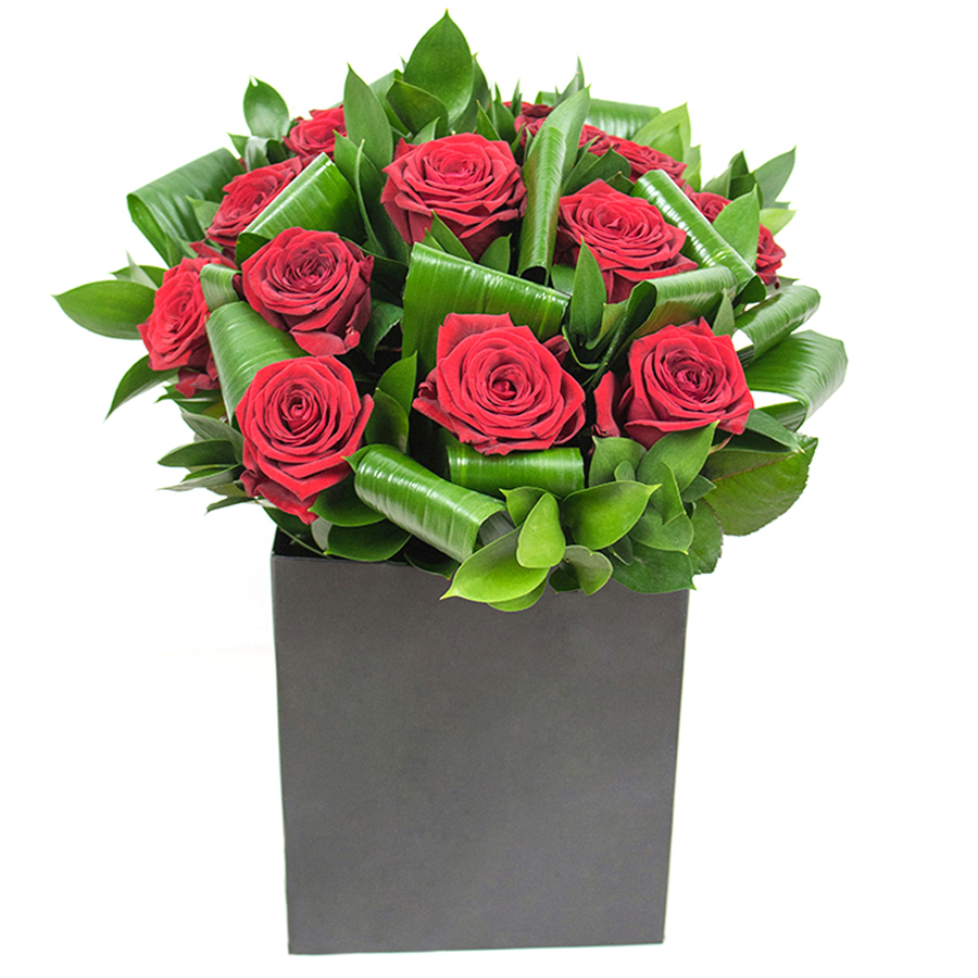 Every flower is carefully hand-selected, ensuring that only the finest specimens are chosen to create this extraordinary arrangement. The captivating red roses, paired with impeccably fresh green accents, offer a dramatic and elegant visual composition that is bound to impress and inspire.